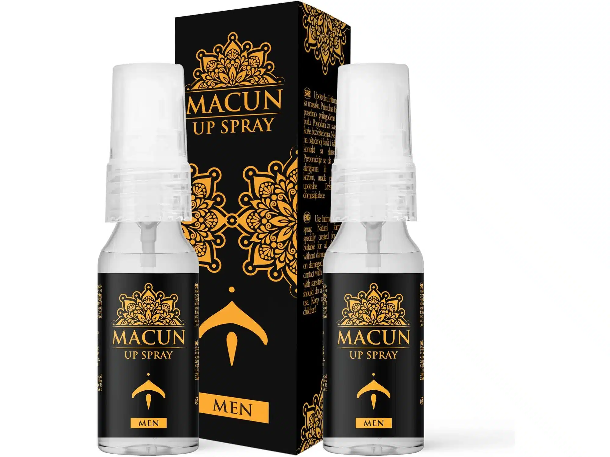 Macun UP sprej (10ml 15 upotreba) 2kom je izradjen isključivo od biljnih sertifikovanih sirovina i zdravstveno je ispravan. Koristi se za masažu polnog organa muškaraca, neposredno pre planiranog polnog odnosa. Dokazano je da ekstrakti biljaka koje ulaze u sastav Macun UP spreja daju jaku potenciju, pojačavaju želju za seksom i odlažu ejakulaciju, tj. produžavaju odnos. Macun UP sprej vraća mladalačku potenciju, daje jaku čvrstinu polnom organu muškarca i daje jaču seksualnu moć.